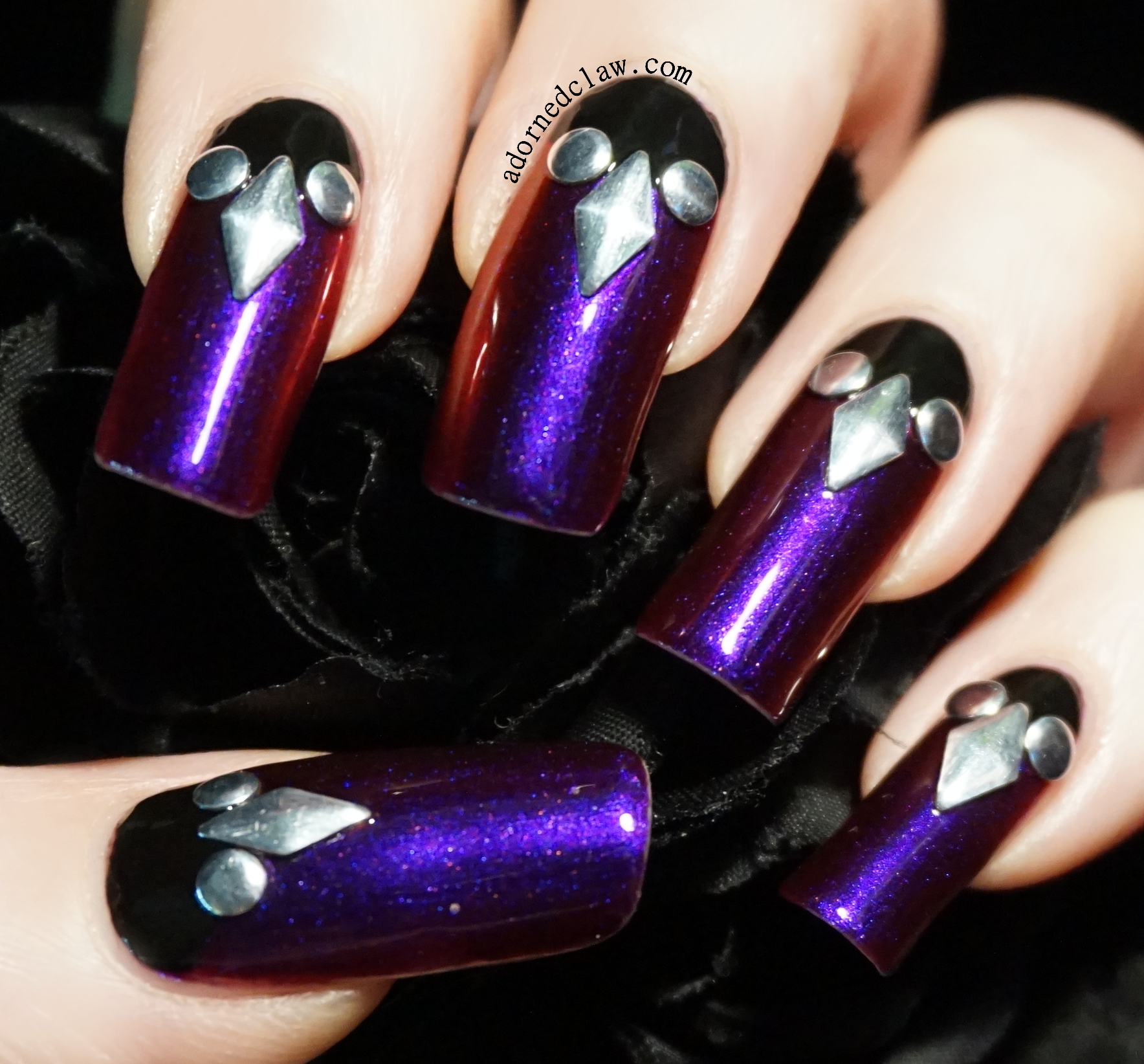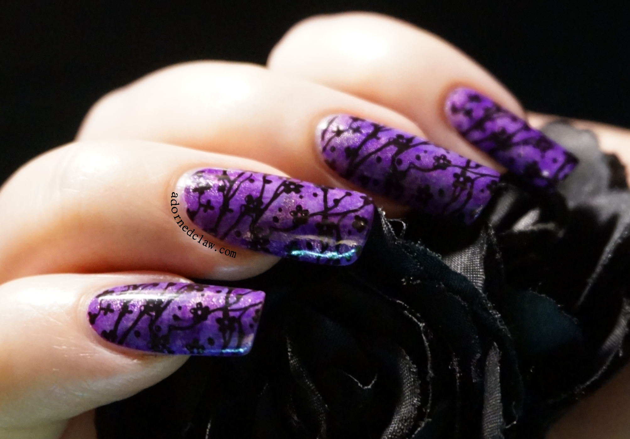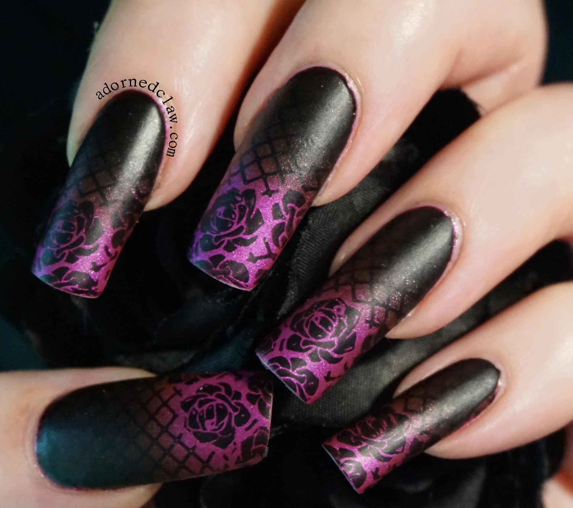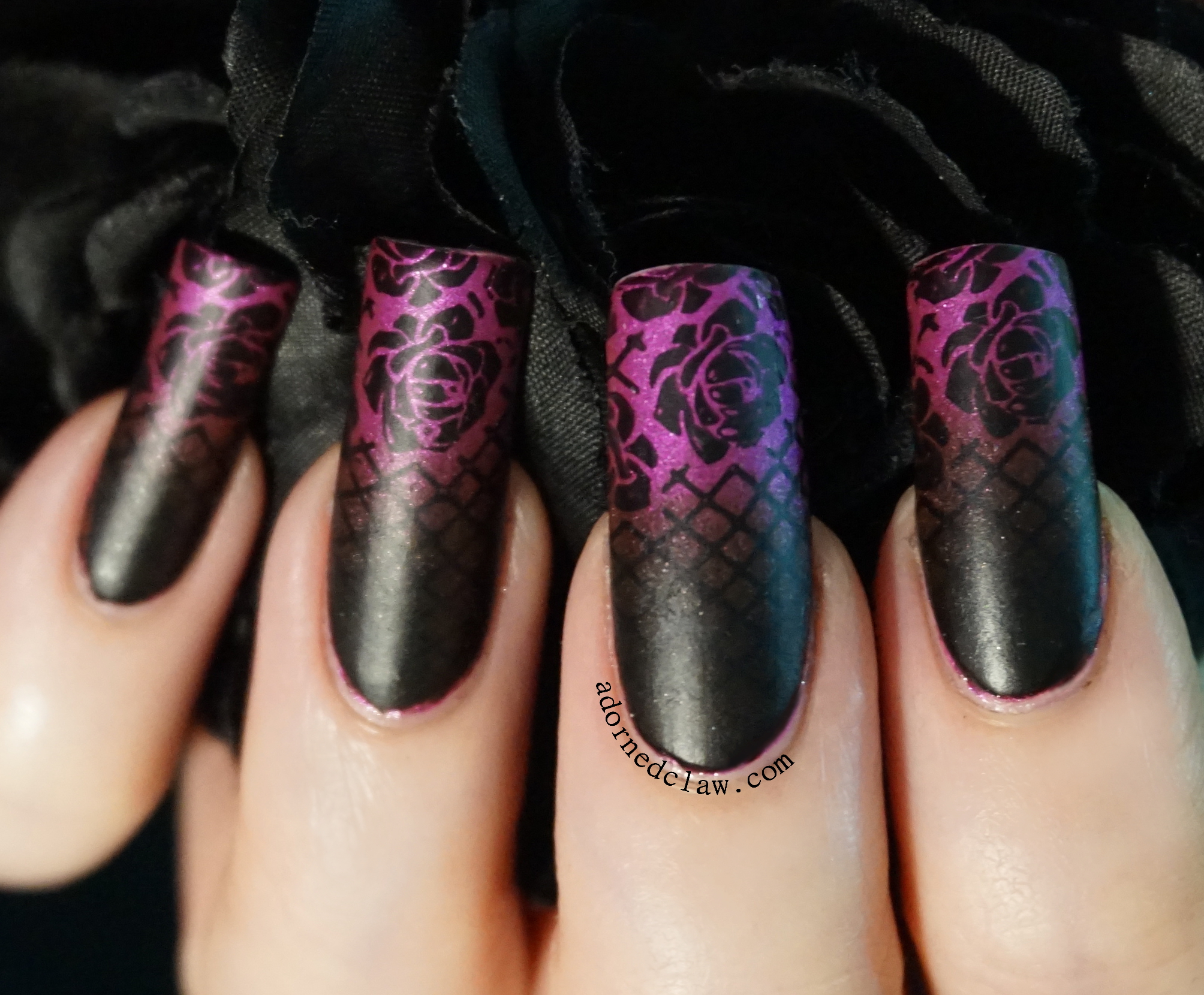 The gradient is Seance from Illamasqua, and Evil from NYC, the image is from Moyou stamping plate Gothic 03 and Hit The Bottle Black as Night.