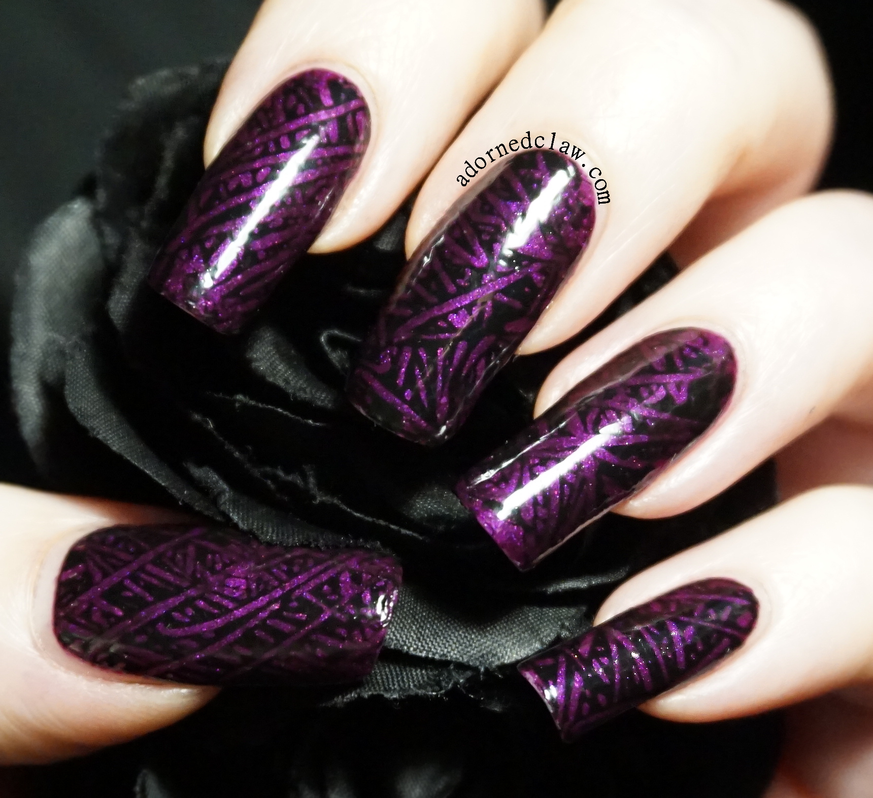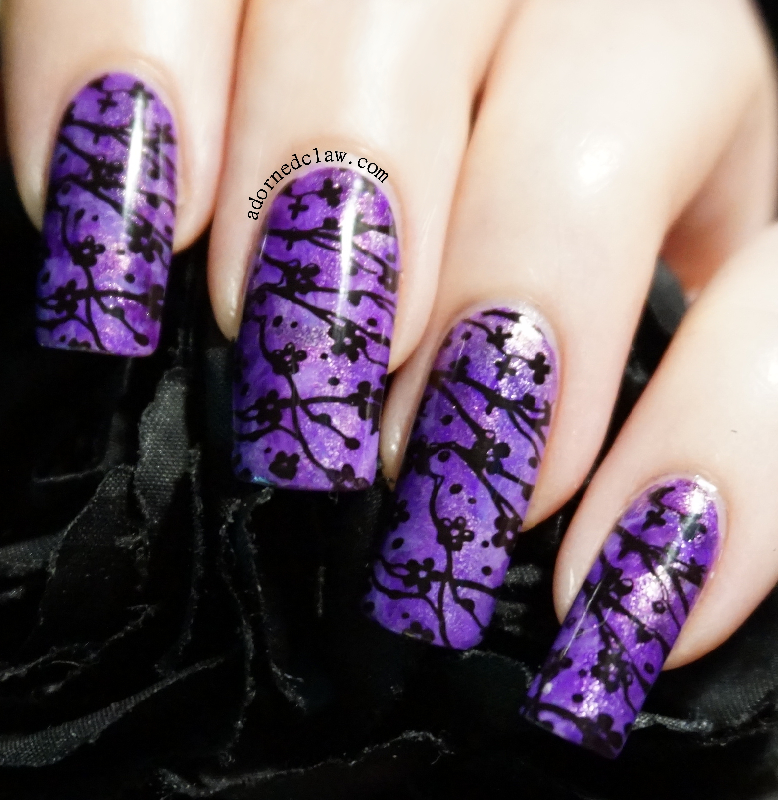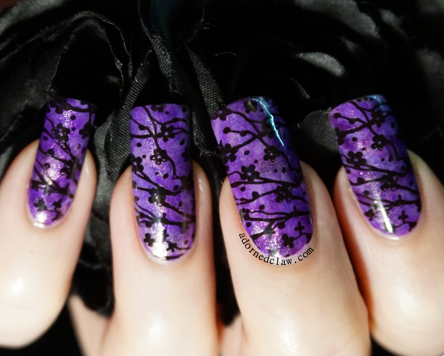 The gradient is Seance from Illamasqua, and Evil from NYC, the image is from Moyou stamping plate Gothic 03 and Hit The Bottle Black as Night.