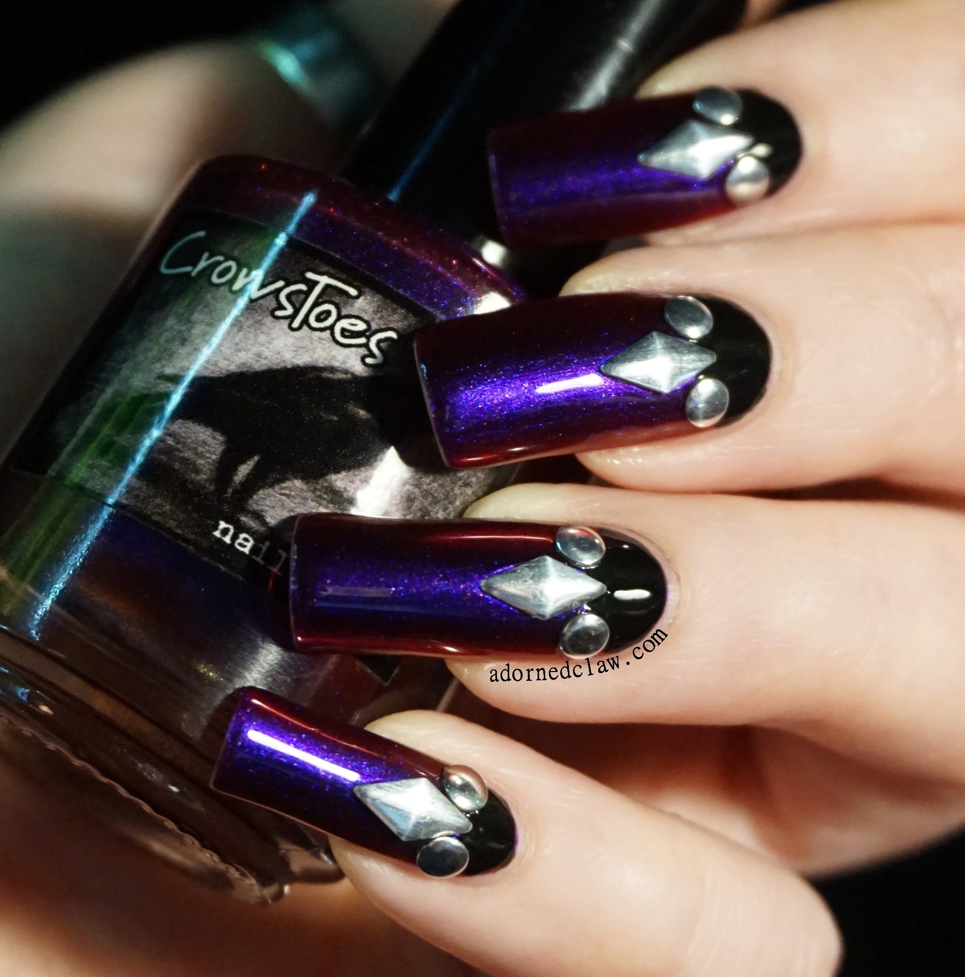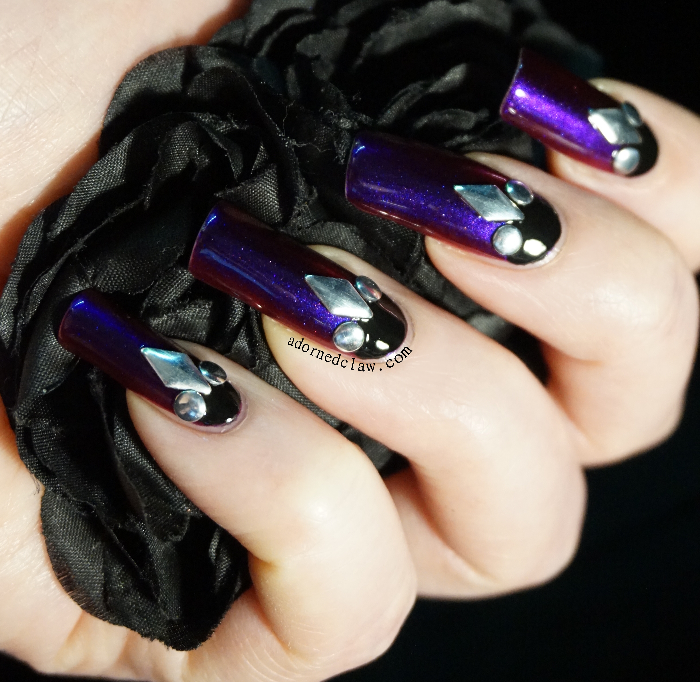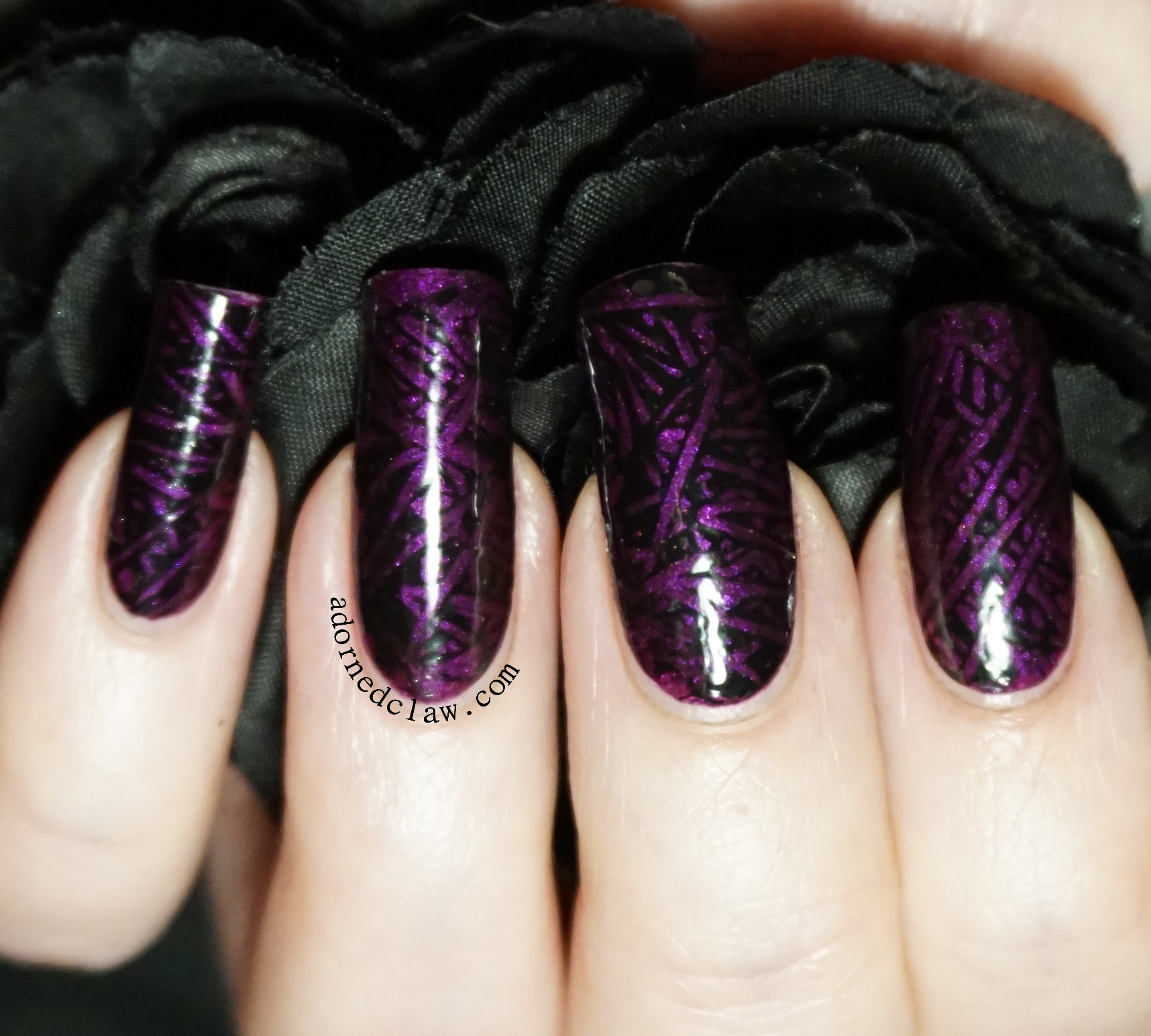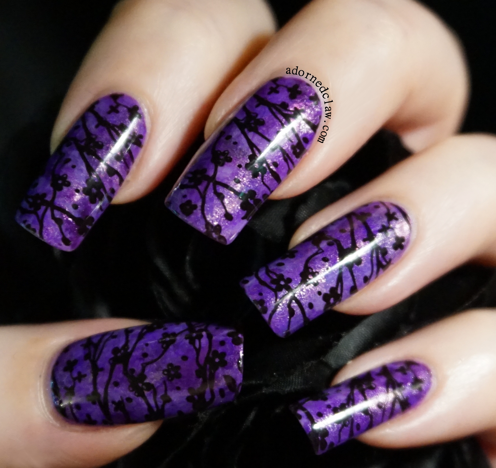 The gradient is Seance from Illamasqua, and Evil from NYC, the image is from Moyou stamping plate Gothic 03 and Hit The Bottle Black as Night.