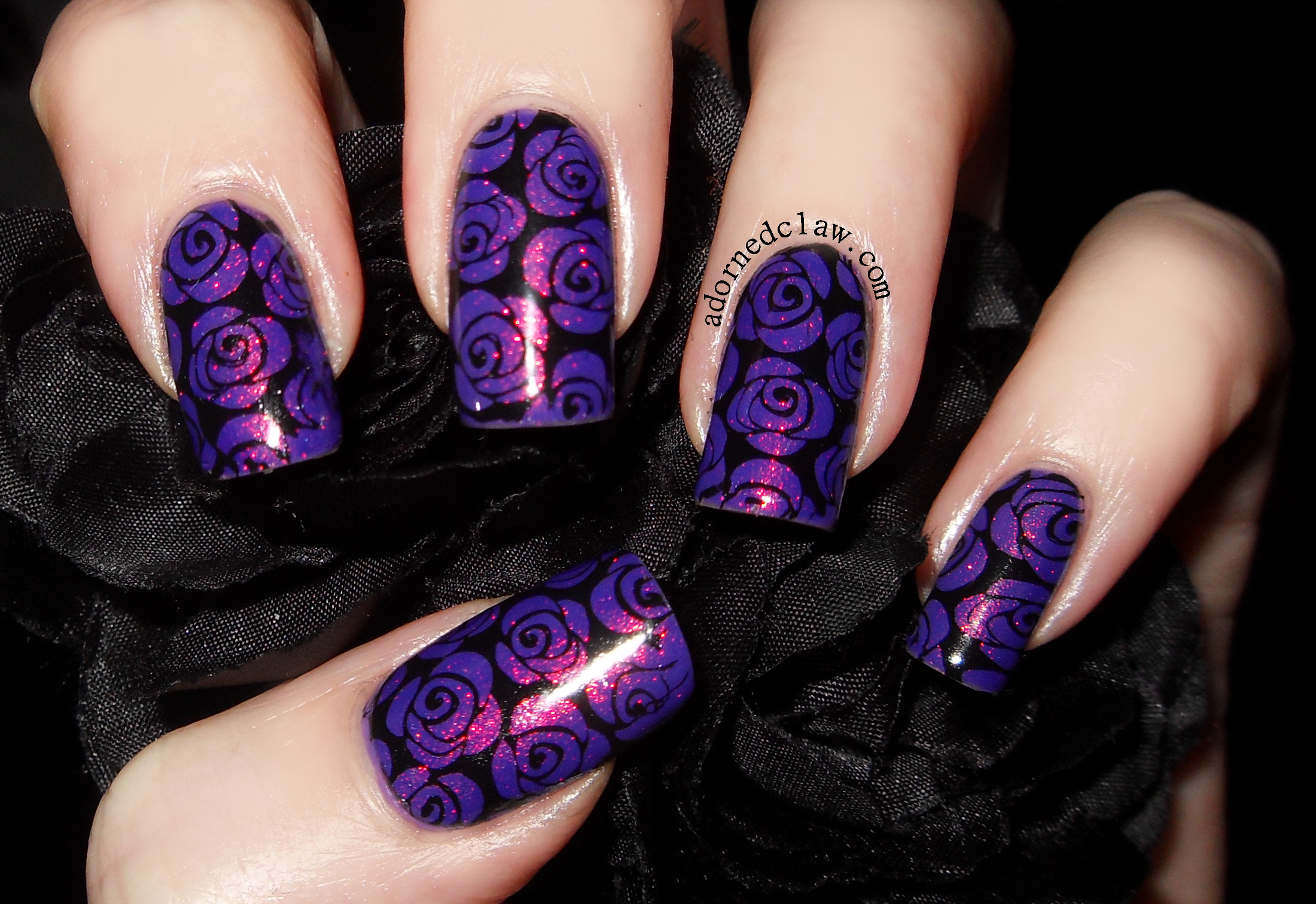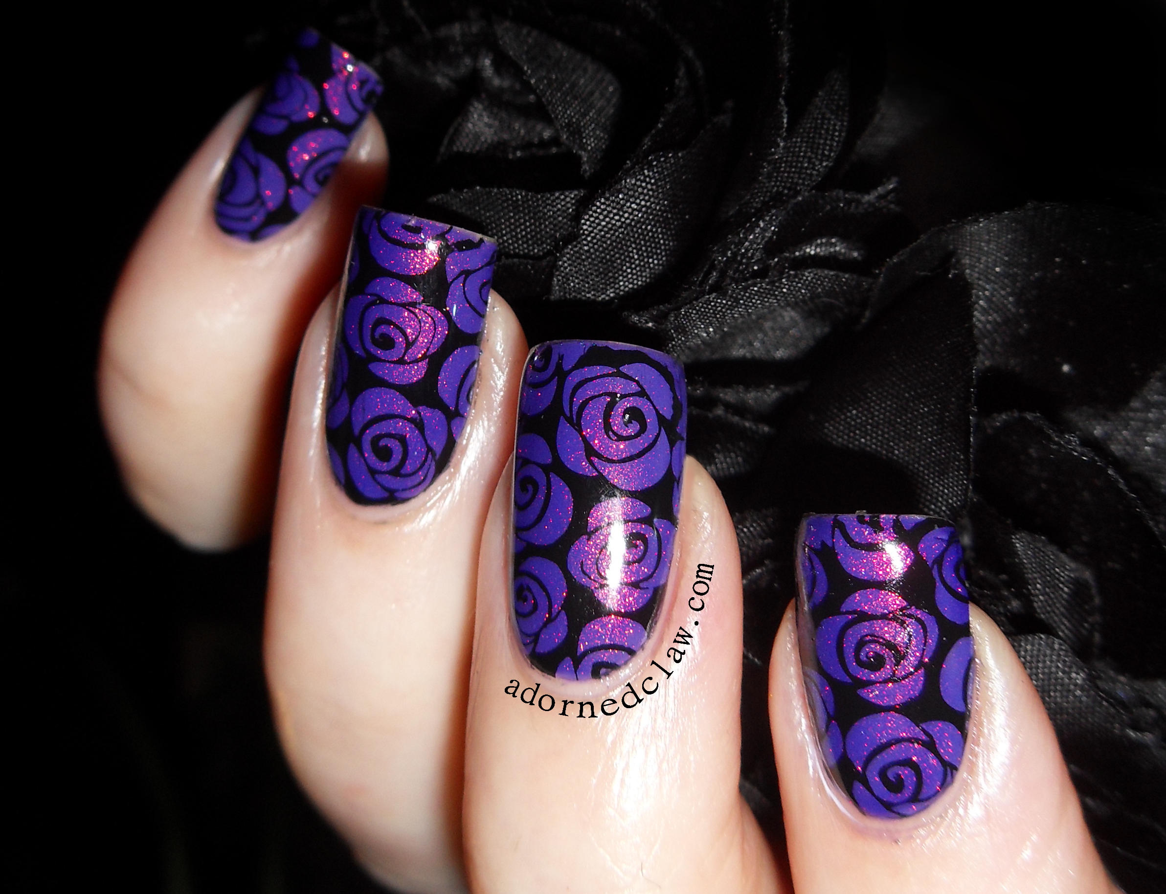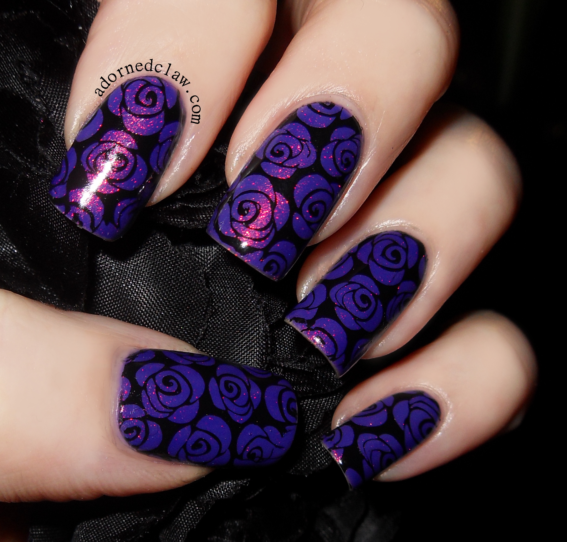 I started with two coats of Good to Grape, It’s a really nice light purple but it takes ages to dry :/ when it was eventually dry I added two thin coats of fantasy fire. For the roses I used Moyou Pro plate 07 XL