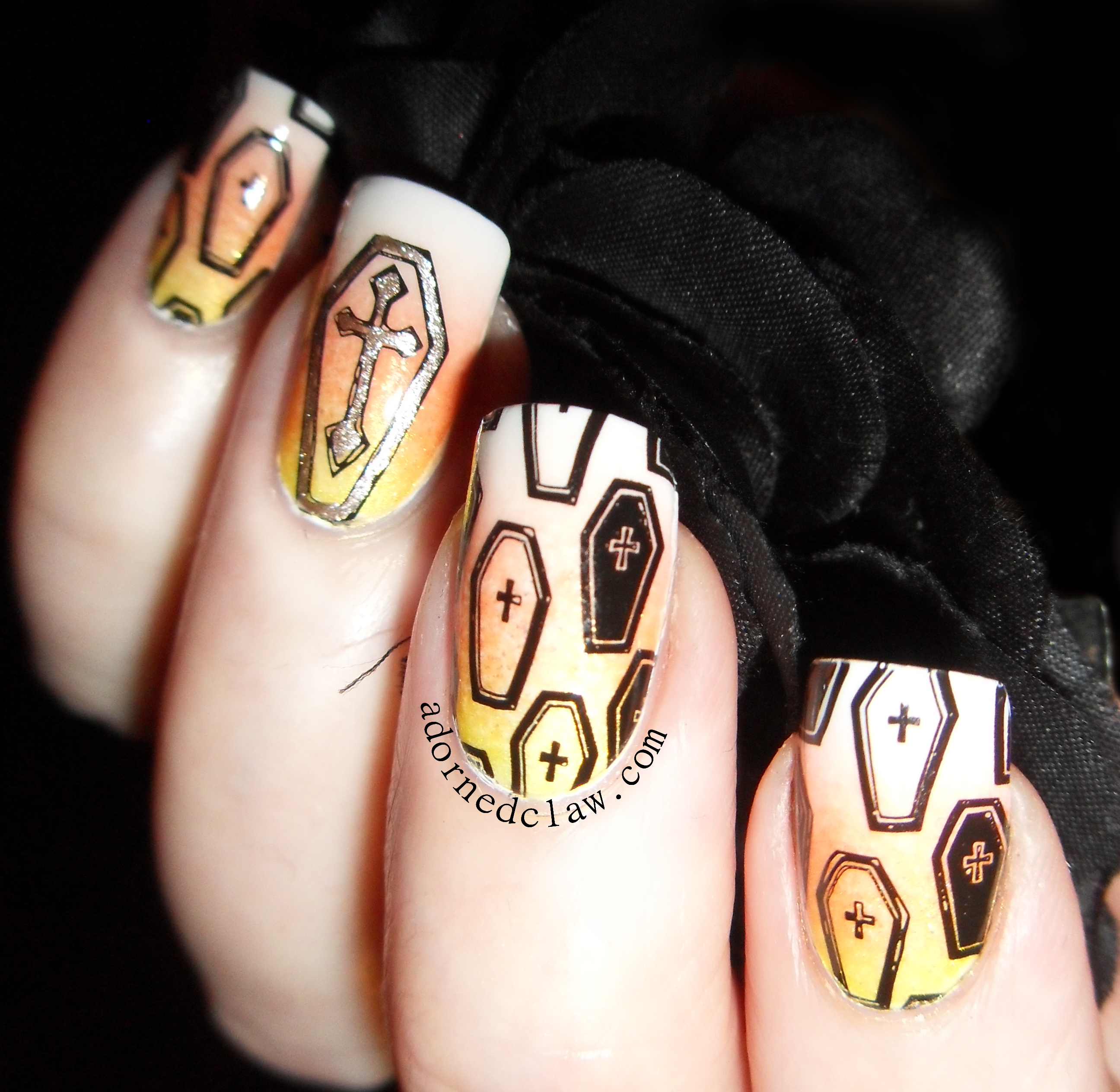 Starting with a white base I used Lite, Shirley Temple and Snow Me White for the gradient, then using Hit the bottle black for the coffins.