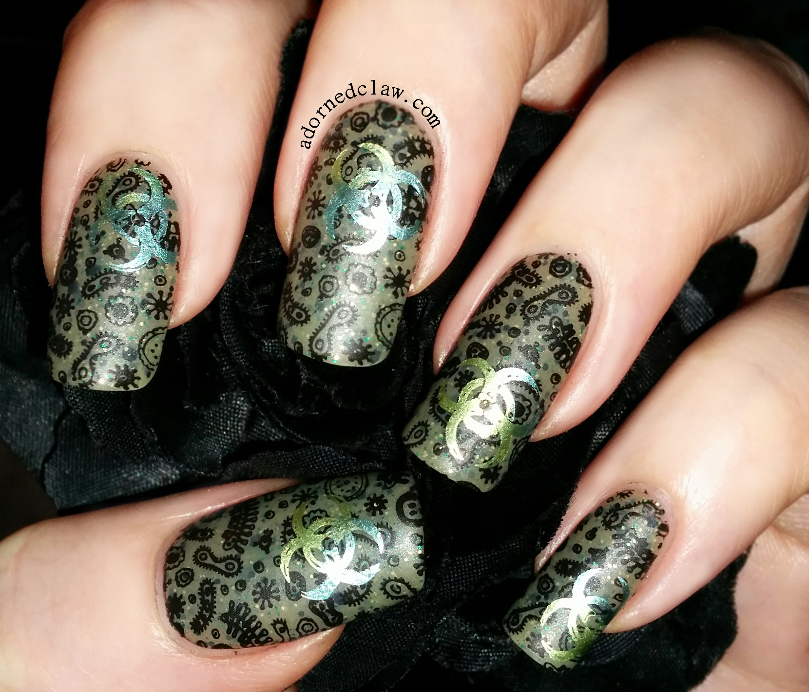 The base colour is Zombie Flesh from Dollish Polish. then I used Plate MM25 along with Hit The Bottle Black for the microbes.