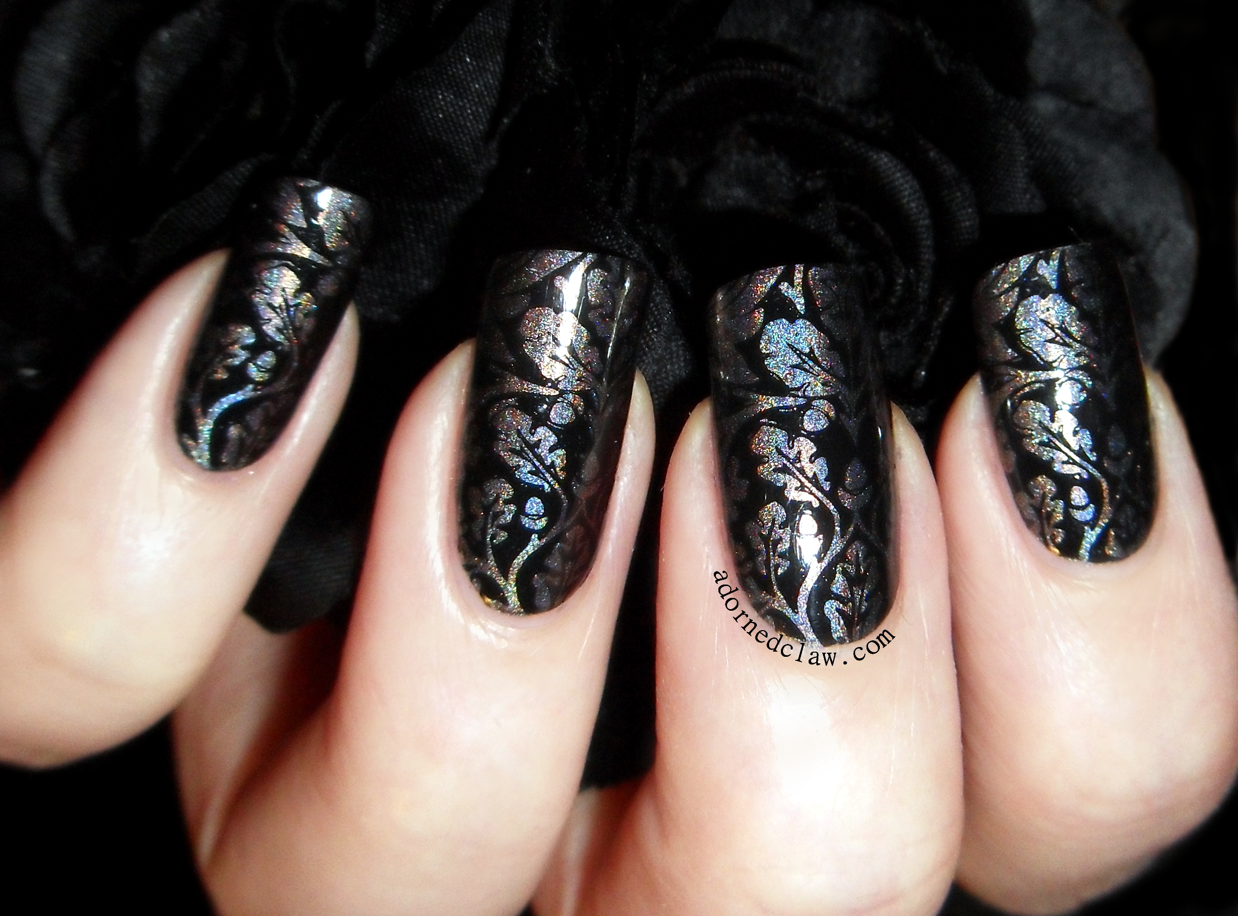 I started with a couple of coats of My Little Glacier, then using the center leaf pattern from plate MM07. Here’s the link to the plate Messy Mansion MM07