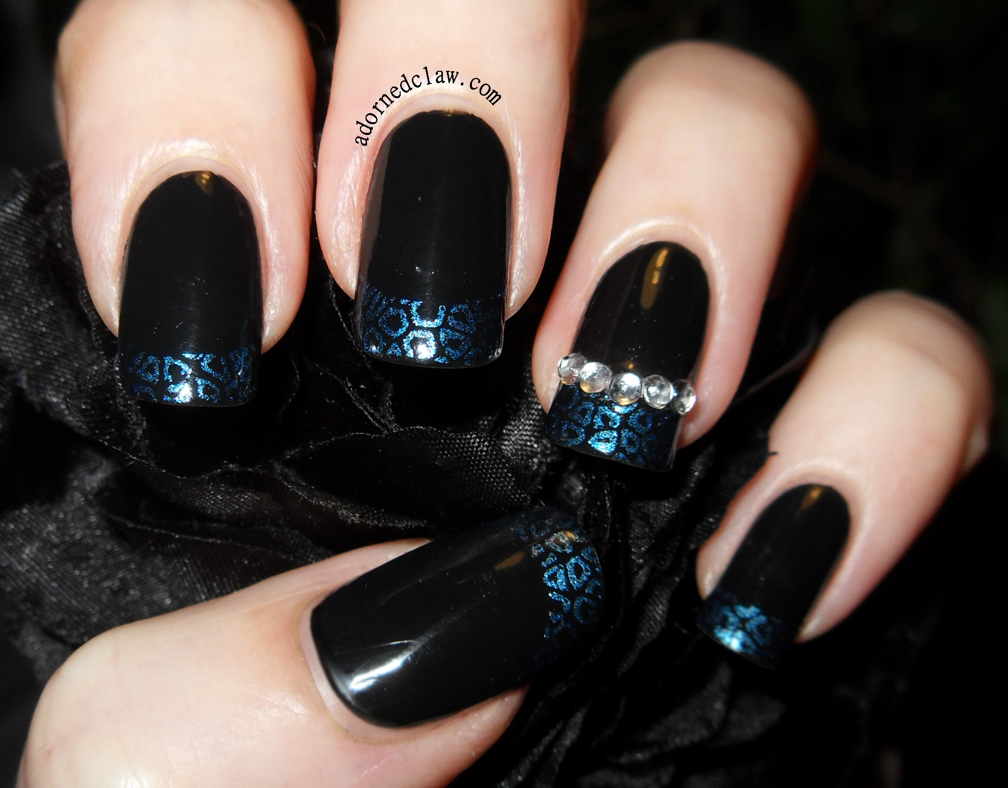 The blue polish I used is Cold Metal from Color Club. It’s amazing for stamping! 😀 then I added the sparkly rhinestones to my ring finger I used tweezers to position them in a dab of wet topcoat.