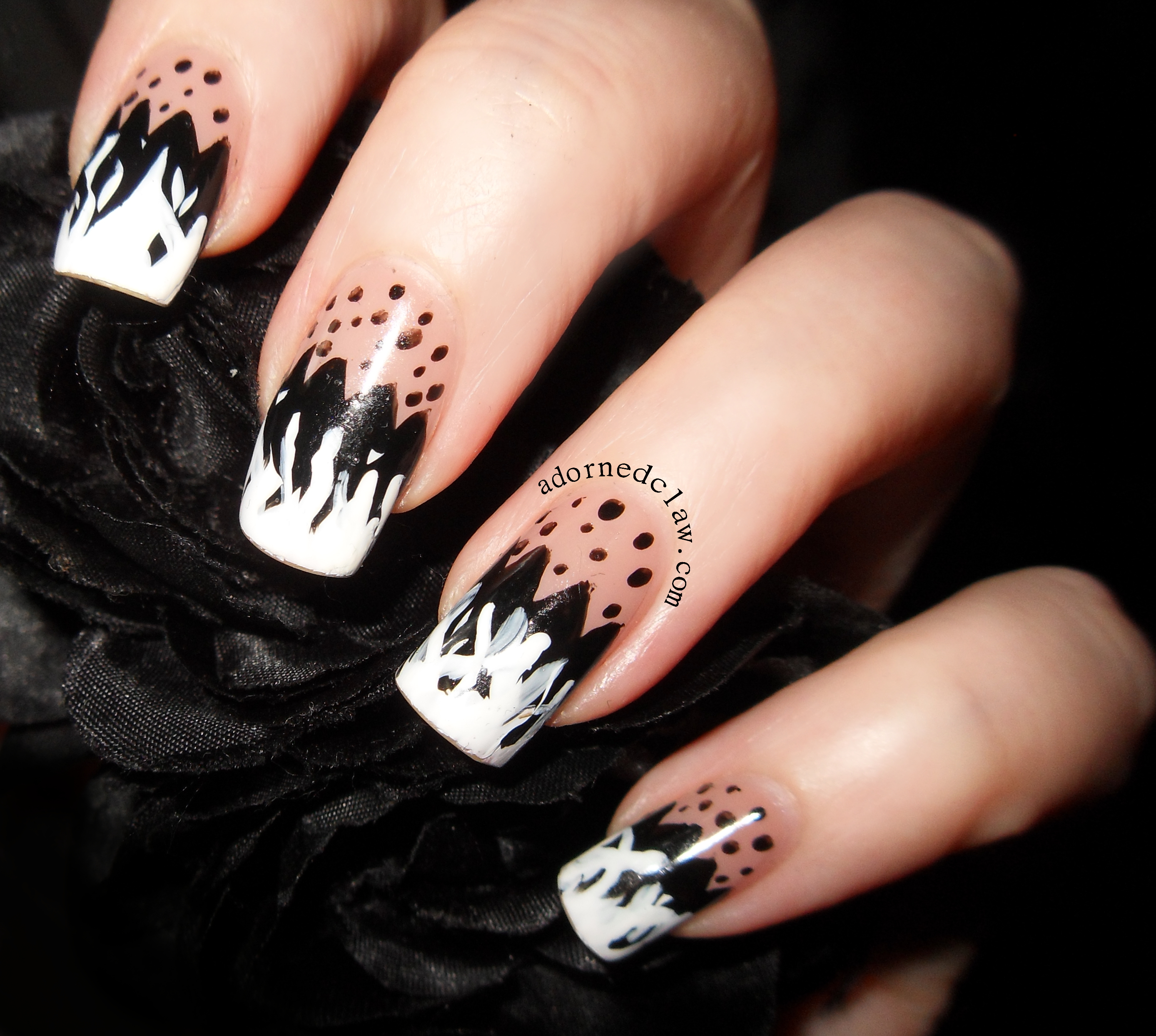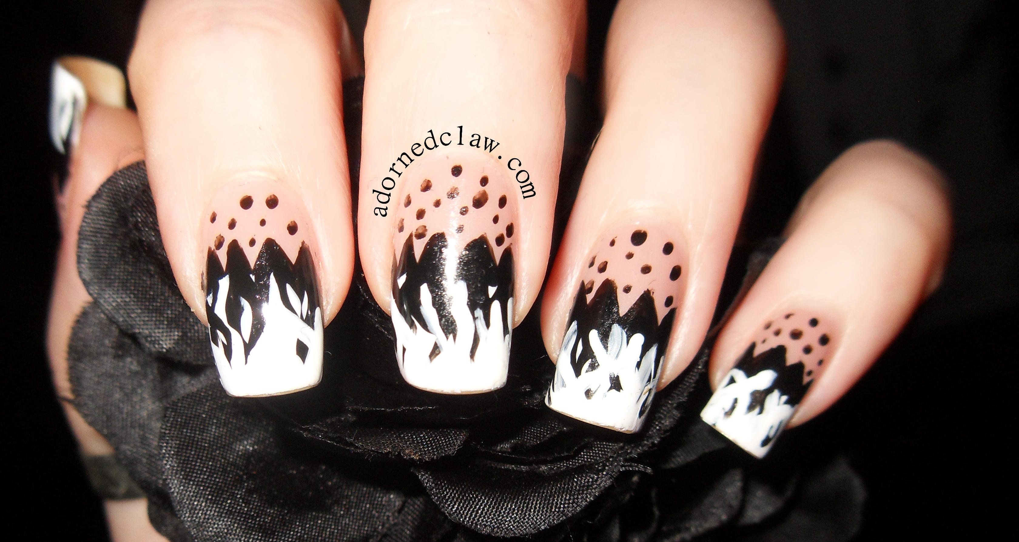 I used Tickle My French-y from O.P.I for the nude base then the Black is Twilight from Filthy Gorgeous, and the white is Ivory Skull from Sally Hansen.