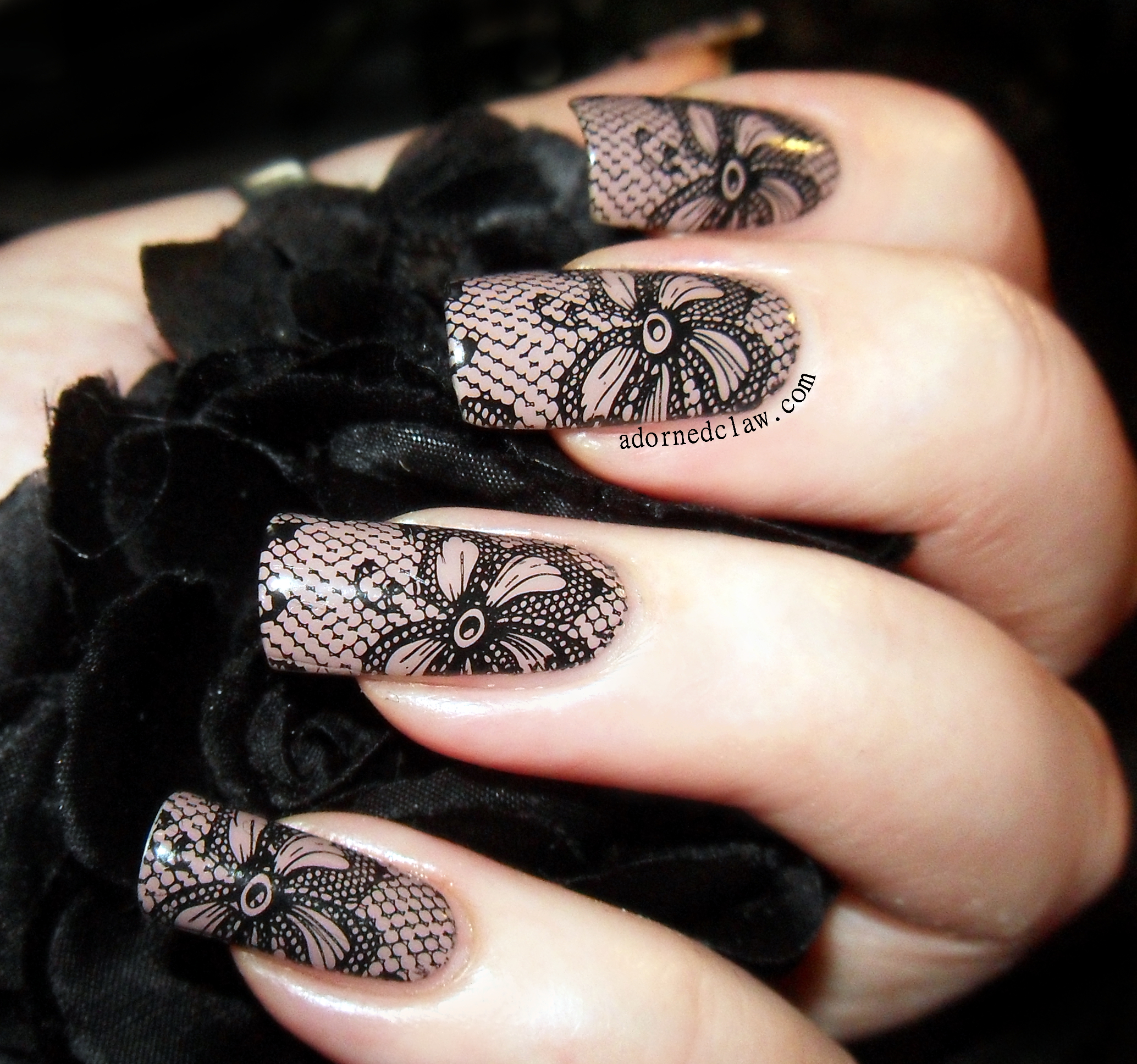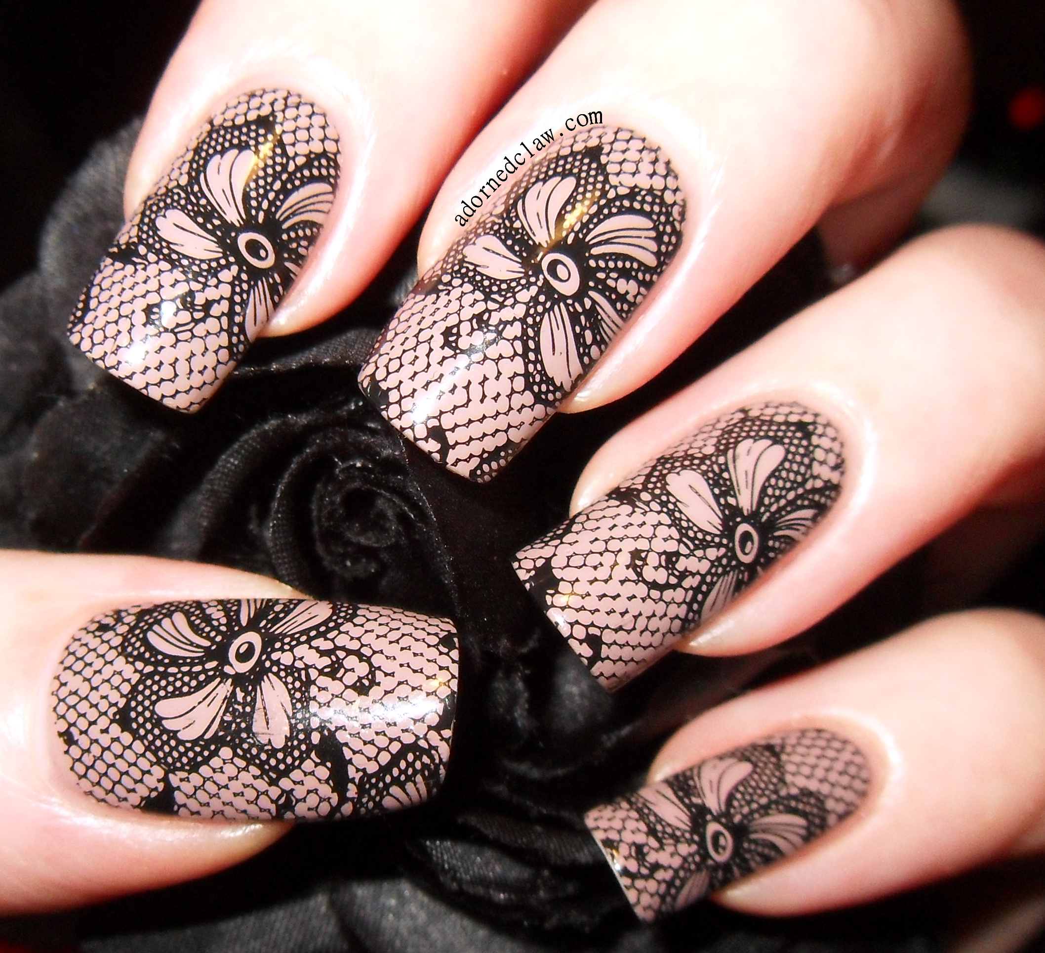 This is Modern Love From Deborah Lippmann stamped with one of the lovely lace images from Messy Mansion plate MM44.